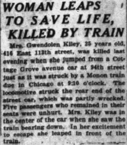 “Mrs. Gwendolen Kiley, 25 years old, 416 East 113th street, was killed last evening when she jumped from a Cottage Grove avenue car at 94th street just as it was struck by a Monon train due in Chicago at 9:10 o’clock.  The locomotive struck the rear end of the street car, which was partly wrecked.  Five passengers who remained in their seats were unhurt.  Mrs. Kiley was in the center of the car when she saw the train bearing down.  In her excitement to escape she leaped in front of the train.”[i]